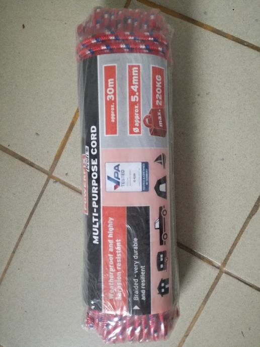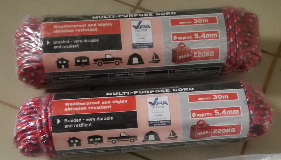 Prodam novo, še nikoli uporabljeno vrv, debeline 5,4 MM, dolžine 30 metrov. Nosilnost vrvi je do 220 kg. Vrv je še zapakirana, imam dva komada.