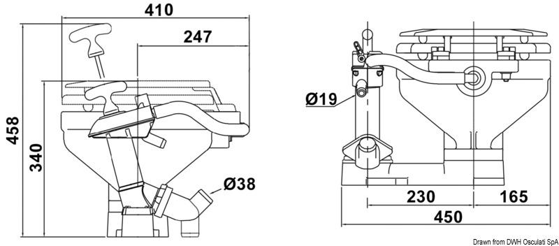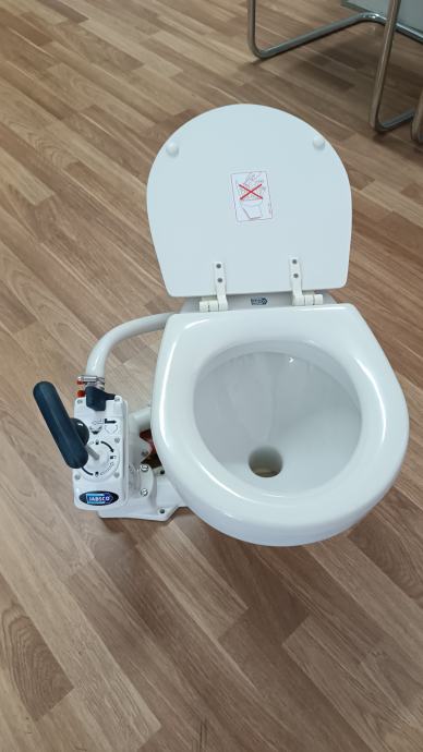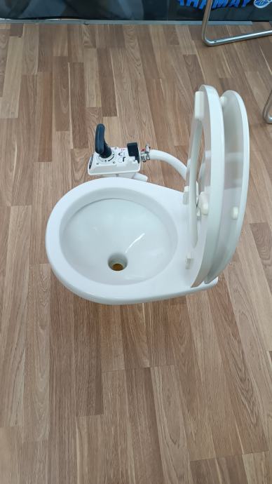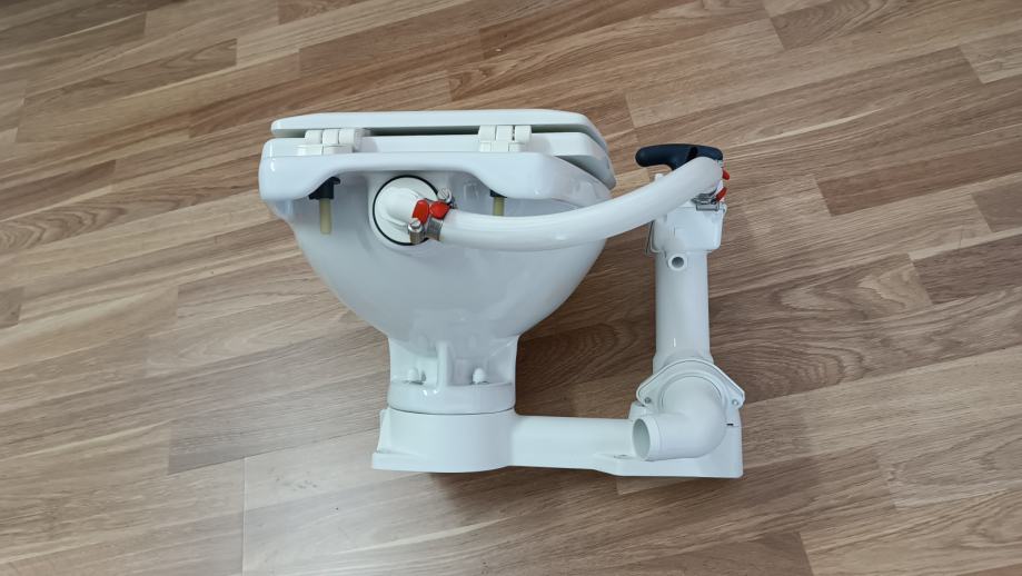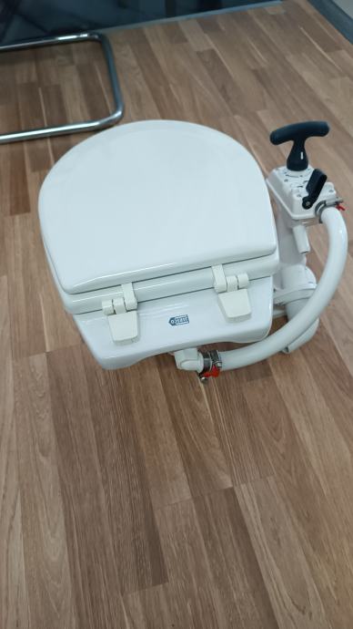 Školjka je iz keramike, Model compact Pokrov je iz lesa. Pumpa z sistemom za blokiranje/odblokiranje antisifona. Vhodna cev je 3/4" (19 mm), izhodna cev je1" 1/2 (38 mm). Školjka je NEUPORABLJENA. Bila je demontirana zaradi montaže električnega WC.