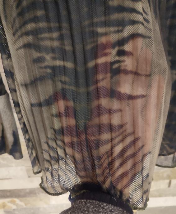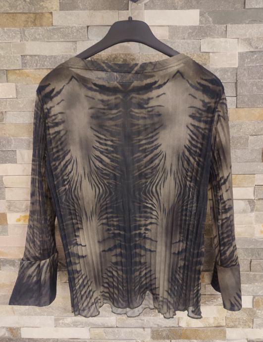 Ženska prozorna plisirana bluza v črno in zeleno - kaki barvi. Velikost primerna za S-36, dolžina 53 cm, širina čez prsi 43 cm, dolžina rokava 49 cm. Material: raztegljiv.
