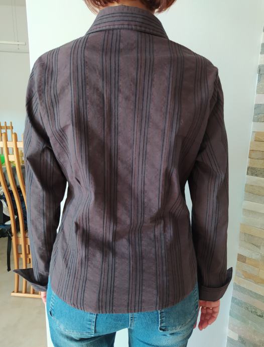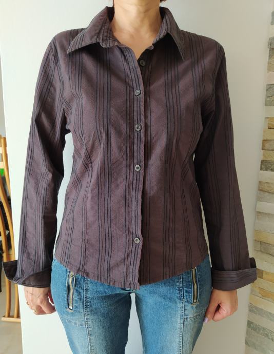 Ženska srajčna bluza z dolgimi rokavi v rjavo črno črtastih odtenkih barve znamke Saix. Velikost 42 (primerna za S/M), dolžina 57 cm, širina čez prsi 47 cm, širina čez boke 47 cm, dolžina rokava 61 cm. 41 % bombaž, 53 % poliester, 7 % poliamid, 6 % viskoze in 3 % elastana. Zelo dobro ohranjena.