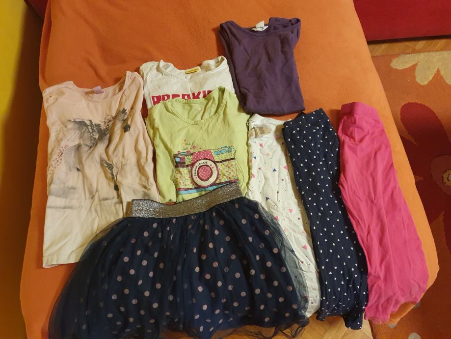 Prodam samo v kompletu- cena: 10 eur:2 majici z dolgimi rokavi, 1 s kratkimi rokavi, 3x 3/4 hlace, krilo in obleka