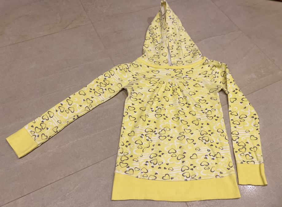 Prodam MAJICO Special Hearts, v lepi nežno rumeni barvi, posuto s številnimi belimi in sivimi srčki, s kapuco in dolgimi rokavi, spredaj žep, v katerem se lahko skrije in pogreje roke. 100 % bombaž, velikost: 140 - kot NOVA.