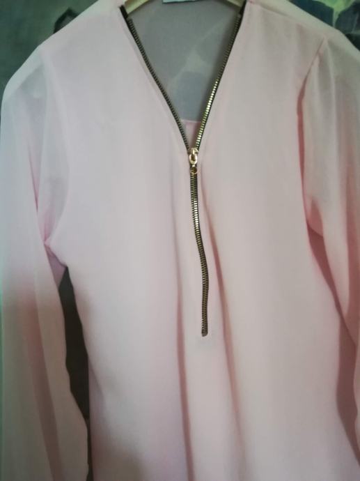 Roza bluza- majica ima spredaj večji ovratnik, zadaj zadrga, velikost S-M, razdalja med rameni 37 cm ( če je zadrga zaprta, nosi se tudi odprto). Nerabljena.