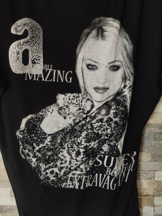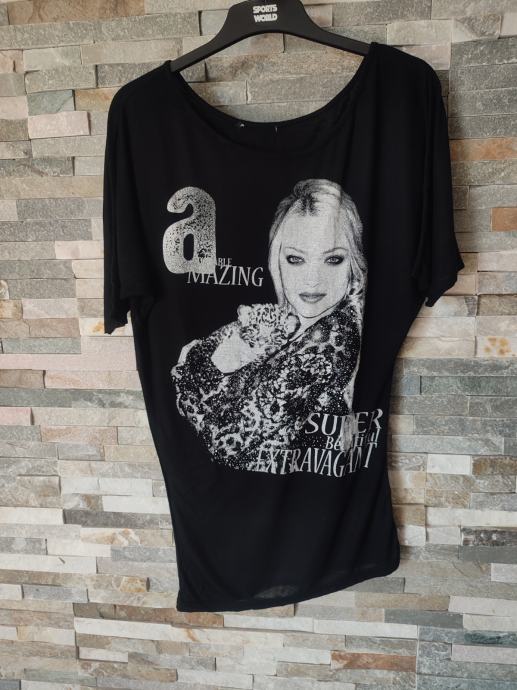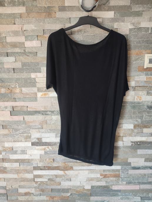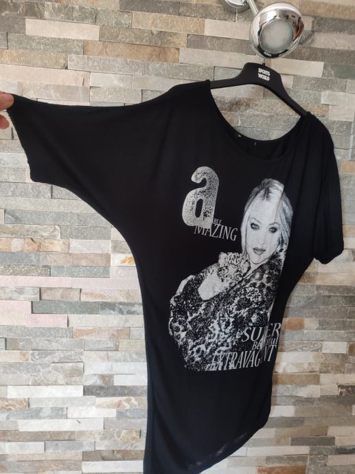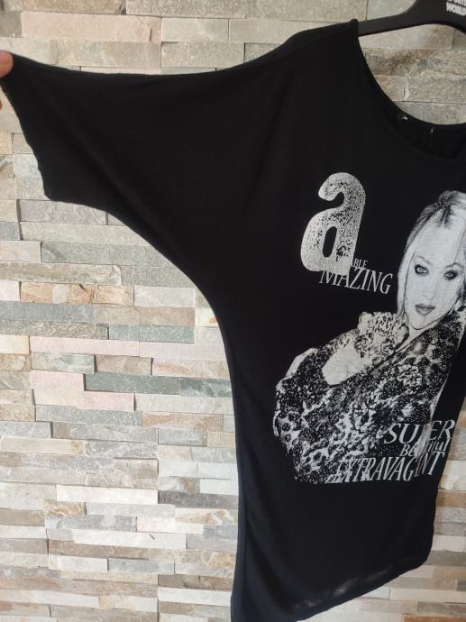 Ženska netopir majica ali tunika v črni barvi z kratkimi rokavi. Majica ima sliko ženske z tigerčkom. Velikost S, dolžina 80 cm, prsna širina 50 cm, širina spodaj 43 cm.
