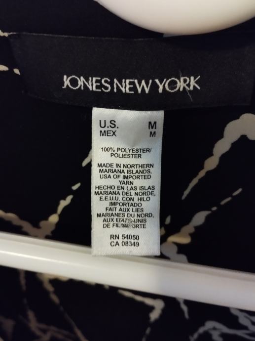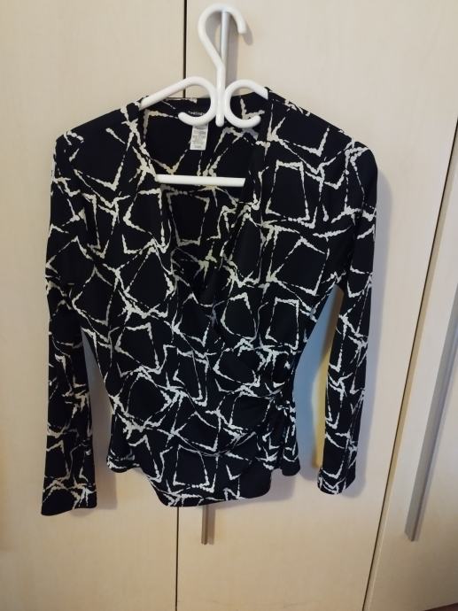 Elegantna majica z dolgimi rokavi. Barva črna z belim vzorcem. Znamka: Jones New York, Velikost: M. Spredaj križno nagubano. Malo elastičen material, lepo padajoč in eleganten. V zelo dobrem stanju. Ni potrebno likati. Kupljeno v Kanadi.