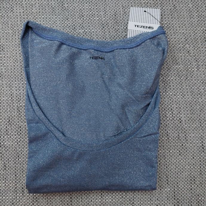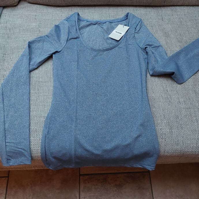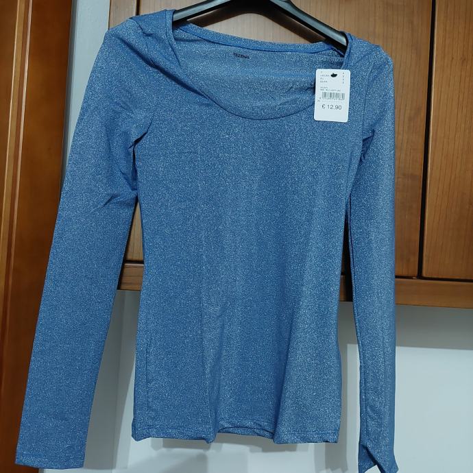 Prodam novo ( z etiketo) elegantno svečano majico v svetlo modri barvi z bleščicami v velikisti S ( ustreza tudi XS in manjši M). Majica je telirana, se lepo poda telesu, barve so lepše kot na fotografiji.