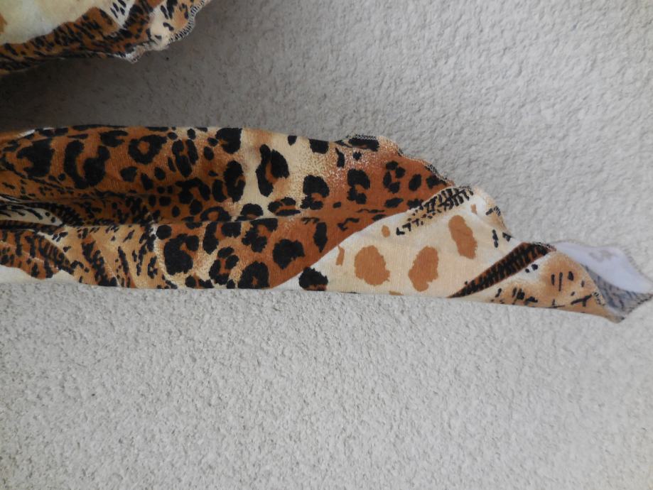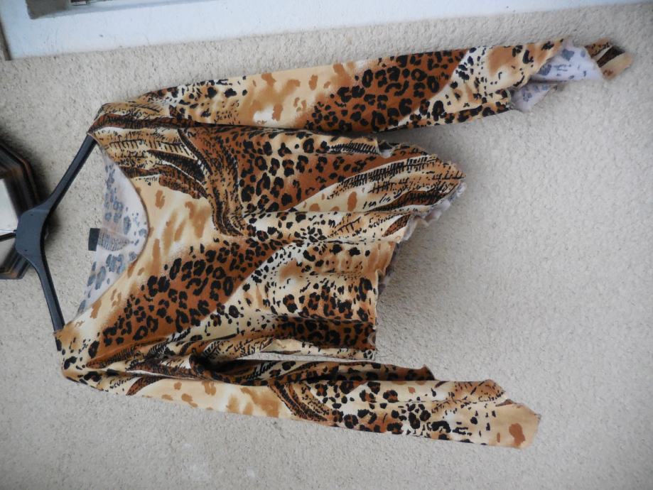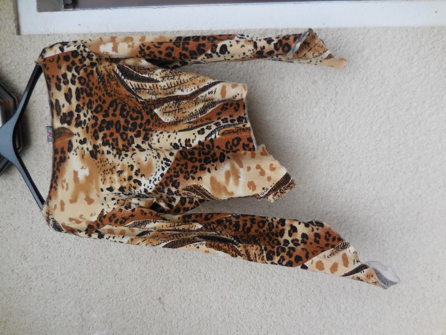 Lepo ohranjena kratka majčka z živalskim vzorcem z zvončastimi rokavi. En del majčke je daljši kot drugi. Je raztegljiva.