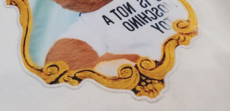 Moschino pulover je v velikosti s. Vsebuje še etiketo. Medved ni plastičen potisk in se ne bo uničil. Material: bombaž.