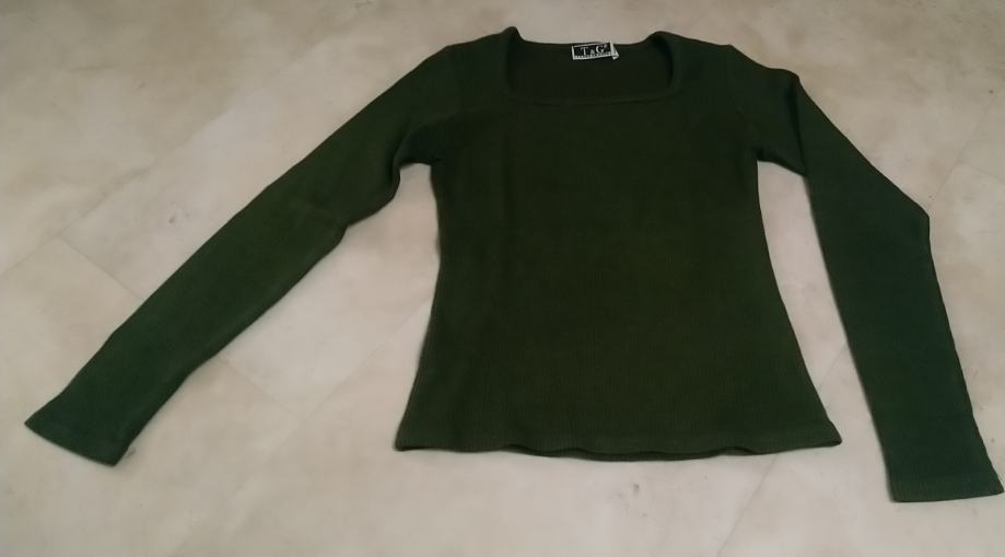 Ženska majica z dolgimi rokavi v olivno zeleni barvi s kvadratnim izrezom, italijanske znamke T & G. Velikost 34 (XS), dolžina 48 cm, širina čez prsi 37 cm, širina v pasu 30 cm, širina spodaj 37 cm, dolžina rokava 54 cm.