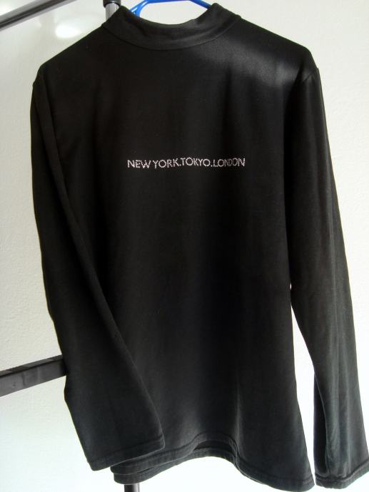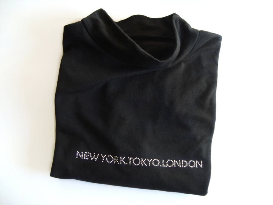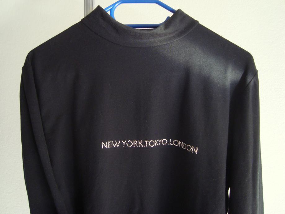 Brezhibna, nikoli nošena, le oprana. Nižji ovratnik, z manjšo aplikacijo iz srebrno kovinskih kamenčkov: "New York. Tokio. London."