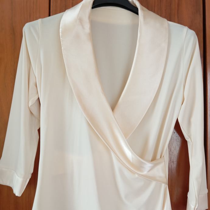 Nikoli nošena, zelo elegantna in svečana, raztegljiva, ima satenast ovratnik in rob rokava, od ene pazduhe do druge meri 45 do cca 50cm, dolžina je 60cm, ne menjam, ptt n i vključena v ceno