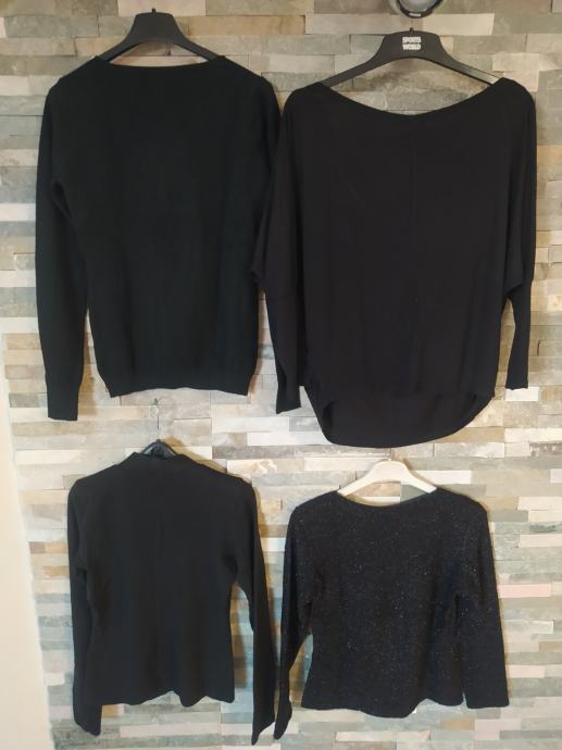 Ženska črna majica z bleščicami, znamke M & V. Majica ima V izrez in je po sprednji dolžini okrašena z bleščicami Velikost S/M, dolžina 57 cm, širina čez prsi 43 cm. Majica je topla in raztegljiva, oblečena samo parkrat, ne manjka nobena bleščica. Cena majice je 8 € + ptt.