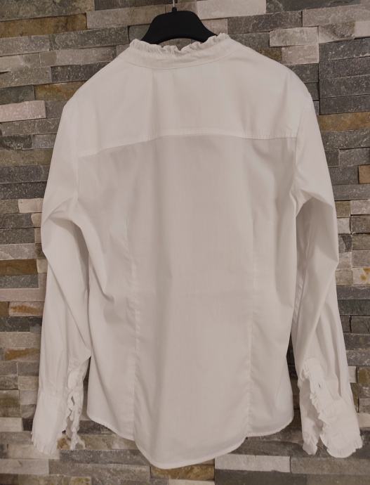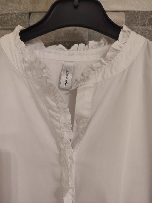 Ženska bela srajca ali bluza z dolgimi rokavi znamke Soyaconcept. Zapira se do polovice sprednje strani na skrite gumbe. Ob ruskem ovratniku in patentih ima majhen volanček. Velikost M, dolžina 64 cm, širina čez prsi 50, dolžina rokava 62 cm. Material 100 % bombaž. Cena je 10 € + ptt.