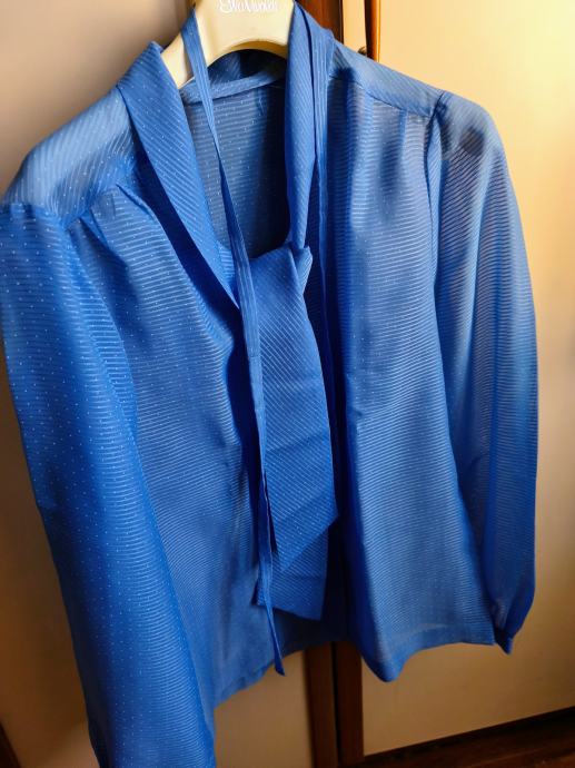 Modra elegantna bluza, šiviljsko delo, L velikost, razdalja paduha-pazduha 50 cm, ramena 40 cm, hrbtna dolžina 68 cm.