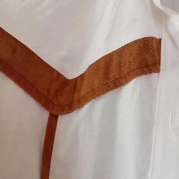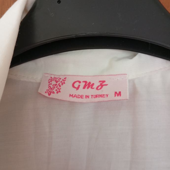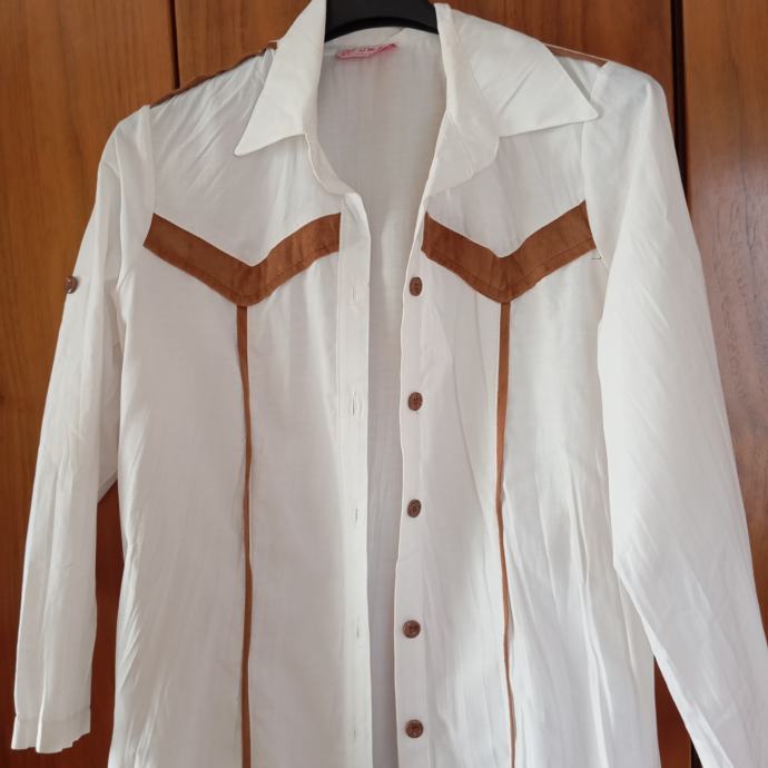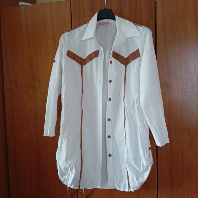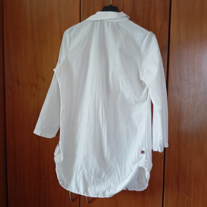 Nošena samo 1x, kot nova, bombažna, videz zmečkanine, ni raztegljiva, od ene pazduhe do druge meri 50cm, dolžina je 80cm, dolžina rokava je lahko dolga ali 3/4, ne menjam, ptt ni vključena v ceno