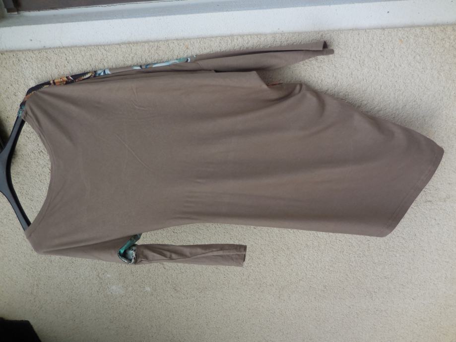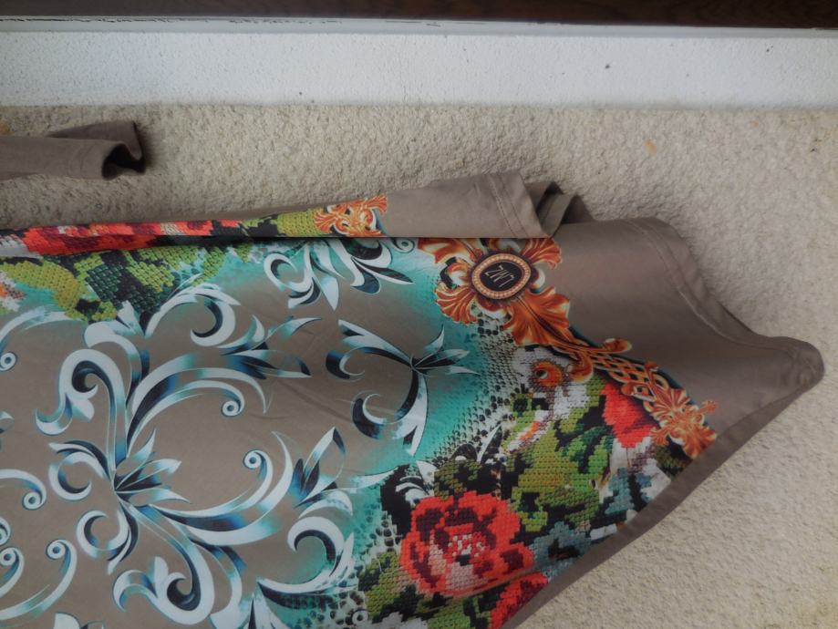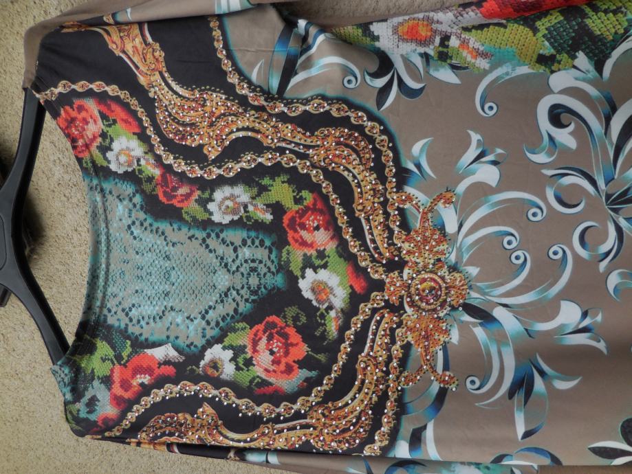 Nenošena kratka obleka ali daljša tunika, je raztegljiva, ni podložena, na sprednji strani ima cvetlični potisk, posut z majhnimi biserčki