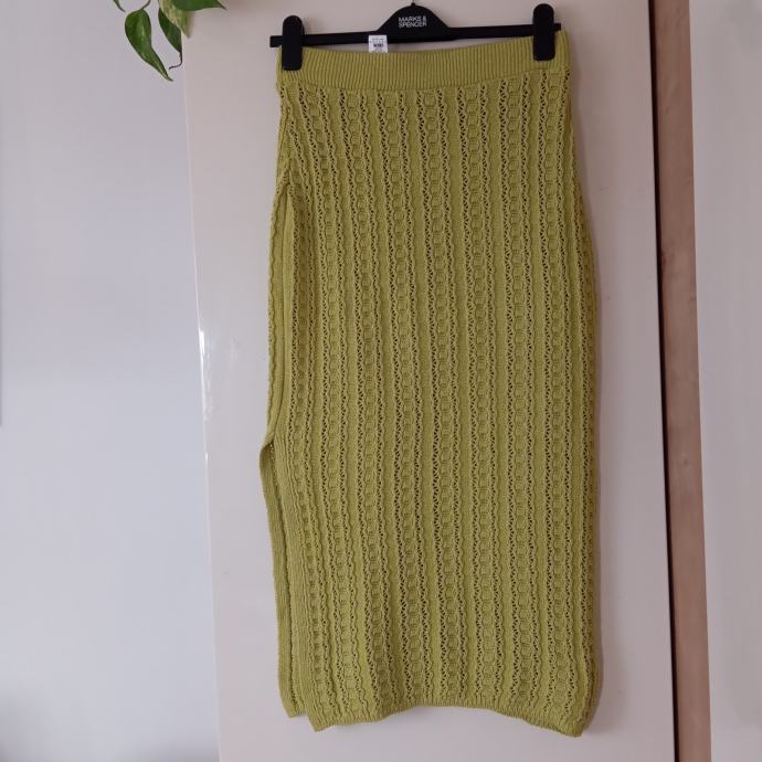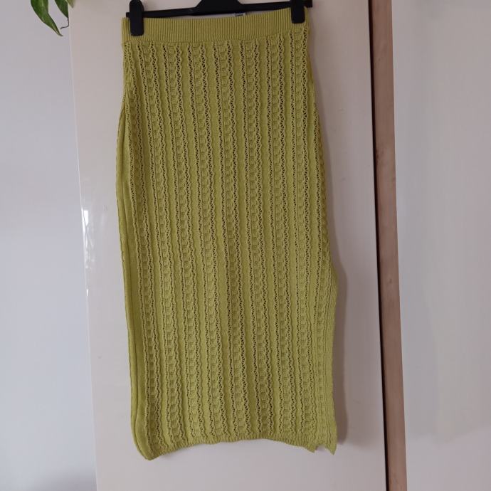 Izredno lepo ohranjeno, pleteno, ni podloženo, je raztegljivo, v pasu ima 5cm široko elastiko in meri od 35 do cca 40cm, dolžina je 80cm, ob strani ima 38cm, dolg razporek, ne menjam, ptt ni vključena v ceno