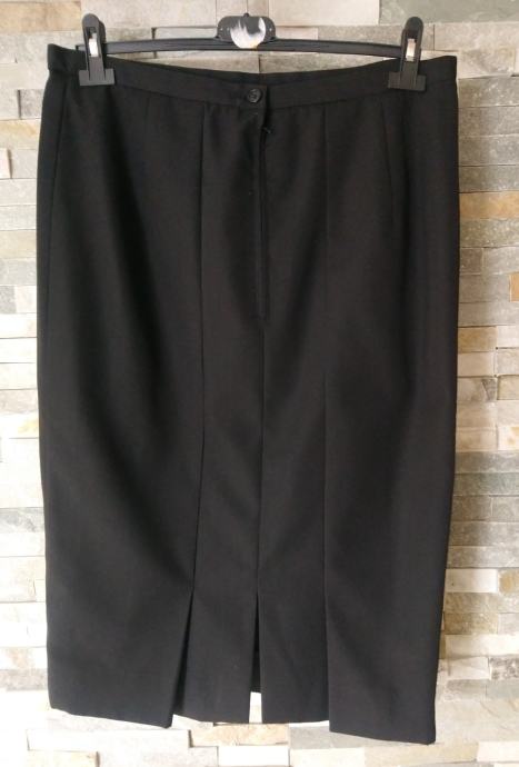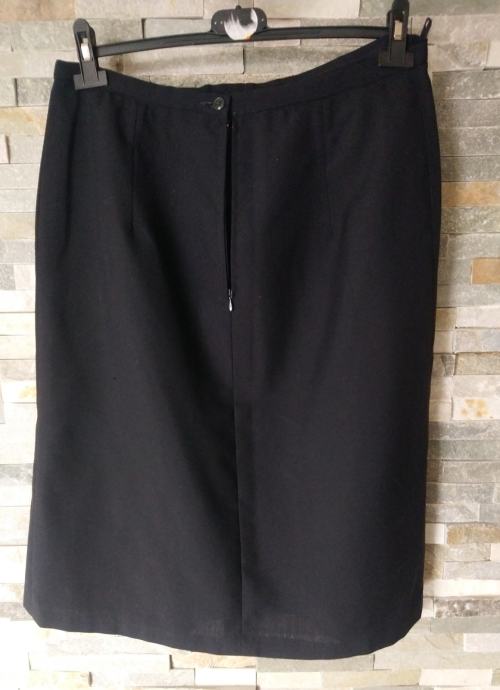 2.Črno krilo z dvema razporkoma na zadnji strani. Zapira se na zadrgo na boku. Gladko blago. Dolžina krila je 67 cm, širina pasu je 43 cm, širina čez boke 53 cm.,