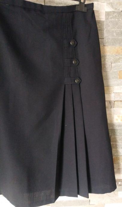 3.Črno krilo z dvema gubama in razporkom na zadnji strani. Zapira se na zadrgo na zadnji strani. Gladko blago. Dolžina krila je 69 cm, širina pasu je 43 cm, širina čez boke 53 cm.,