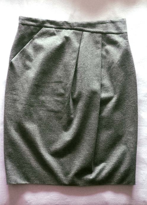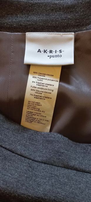 Krilo luksuzne dizajnerske hiše Akris. Sive barve, velikosti 40, obseg okoli pasu 82 cm, okoli bokov 102 cm (brez raztezanja naborka), dolžina 63 cm. Material: viskoza, elastan. Oblečeno dvakrat, kot novo.