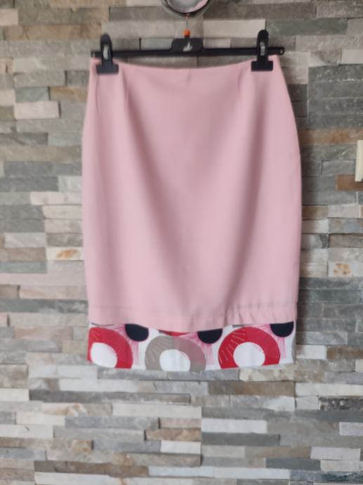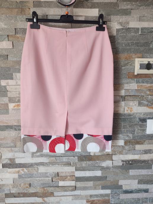 Žensko oprijeta krilo v roza barvi z barvno borduro, slovenske izdelave. Bordura je bila kasneje dodana. Velikost S, dolžina 58 cm, širina v pasu 36 cm, širina v bokih 47 cm. Material: 100 % volna, podloga 100% viskoza.
