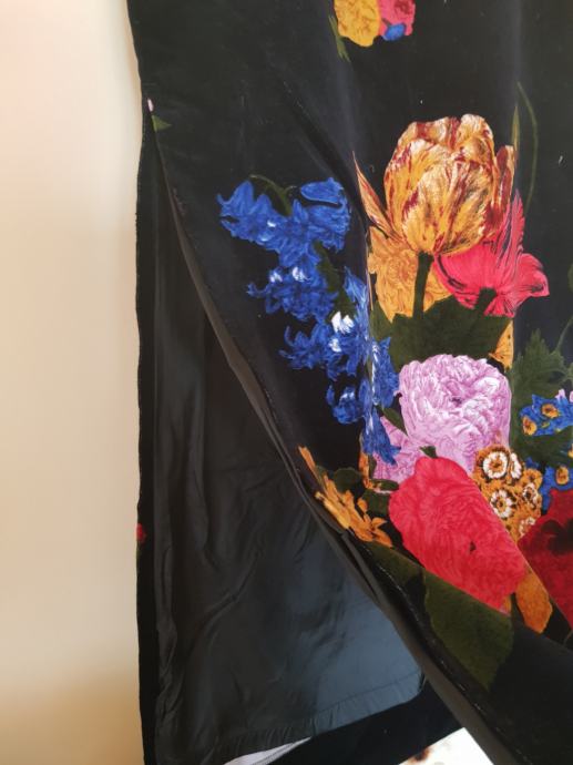 Zelo lepo ohranjeno, zgornji del je bombaž, podloga je viskoza, ni raztegljivo, ob strani ima 60cm dolg razporek