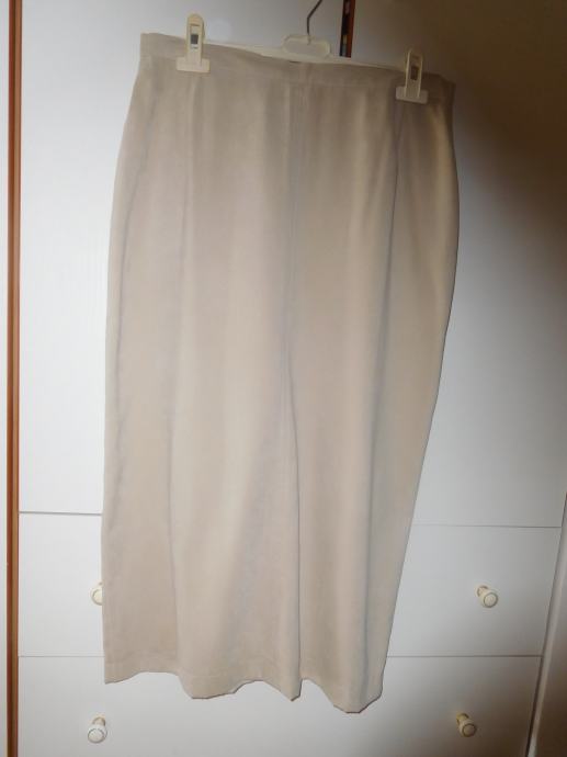 Ima podlogo, zadaj razporek. Zapenja se z zadrgo in gumbom (na zadnji strani).