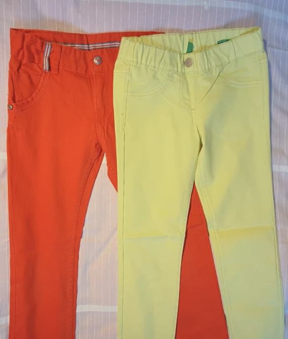 Fluorescentno rumene Benetton hlače velikosti 140/8-9, skinny/strech, z elastiko v pasu in nakazanim 'šlicem', brez dejanske zadrge. Neraztegnjena širina pasu 31 cm, raztegnjena cca 35 cm, dolžina od pasu: 81 cm, od koraka 61 cm.