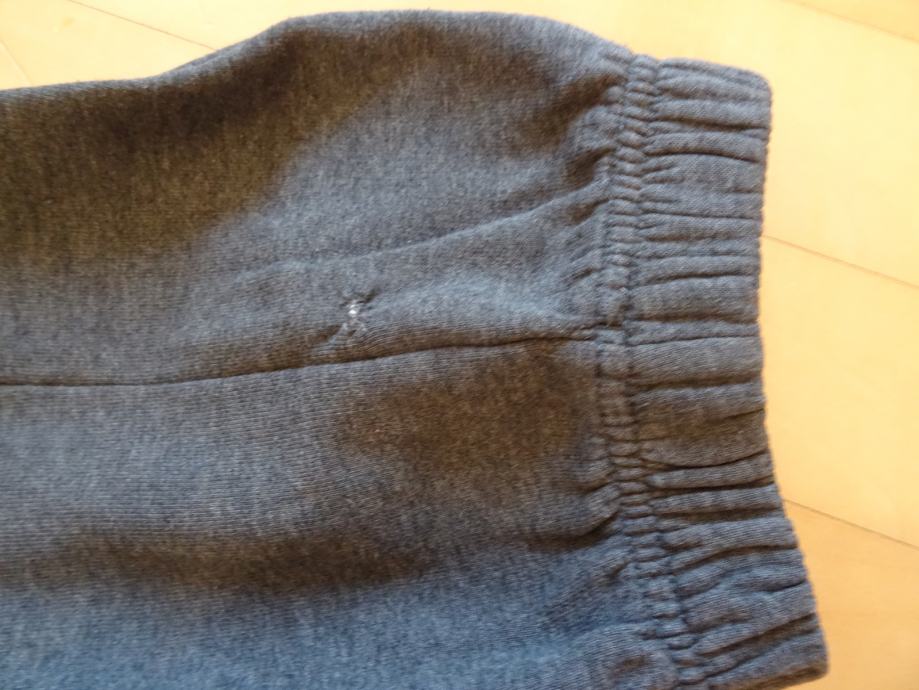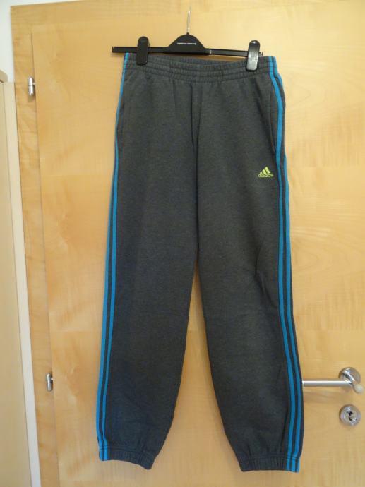 Adidas športne hlače, sive z modrimi črtami, velikost ?, dolžina ob strani 100 cm, širina v pasu 36 cm, dolžina hlačnice od razkoraka do konca 77 cm, z elestiko in zatezno vrvico v pasu, 2 stranska žepa, mala poškodba na hlačnici spodaj - vidno na sliki, popravljeno.