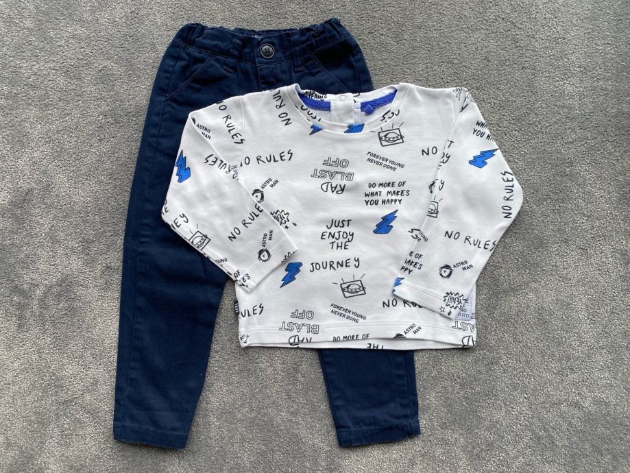 Bebakids otroški komplet bela majica dolg rokav in modre hlače, št. 92