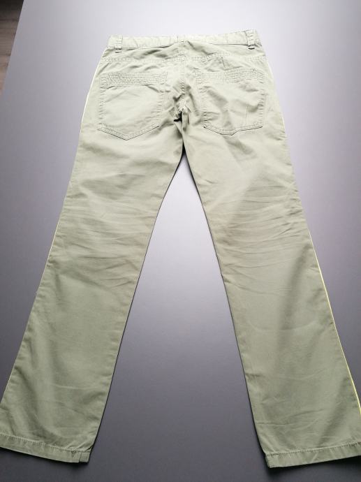 Hlače v olivno-zeleni barvi, znamke Benetton, št. 140. 2 žepa ob strani, 2 zadaj. Zapenjanje na zadrgo in gumb. Iz 100% bombaža. V pasu tudi elastika. Dolžina hlač je 88 cm, v razkoraku pa 63 cm. Možna dostava na Izlake ali v Zagorje, lahko pa pošljem tudi po pošti. Oglejte si še ostale moje oglase po ugodnih cenah.
