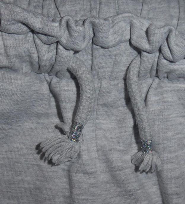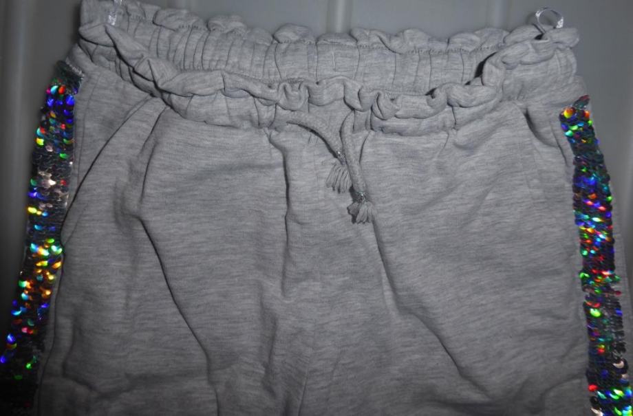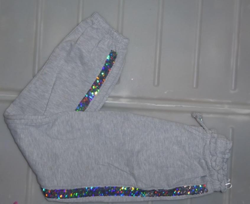 Sicer uradno št. 140, vendar se lahko nosi že prej, zaradi gume v pasu in na hlačnicah. Sive barve, z bleščicami gor&dol.