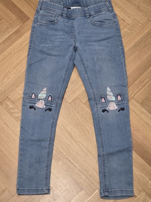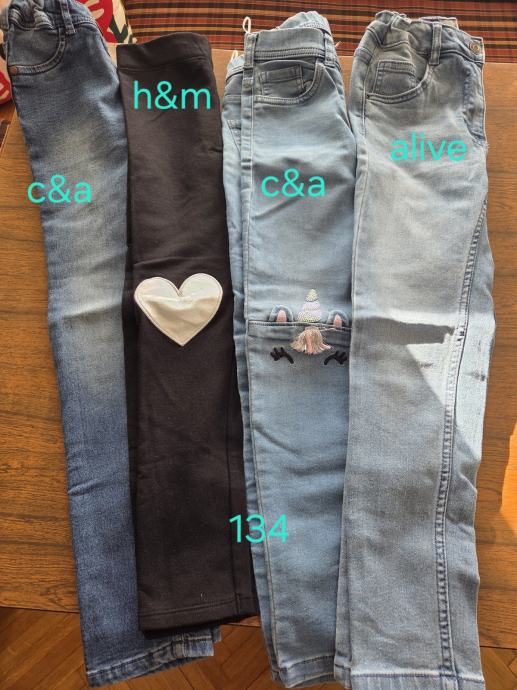 Prodajam komplet rabljenih dekliških hlač v velikosti 134. Komplet vključuje štiri pare hlač različnih ožjih modelov - klasične jeans C&A in Alive z nastavljivim pasom, nove H&M črne toplejše legice s srčkom tudi z nastavljivim pasom in jeggins hlače C&A s samorogom. Vse hlače so zelo lepo ohranjene.