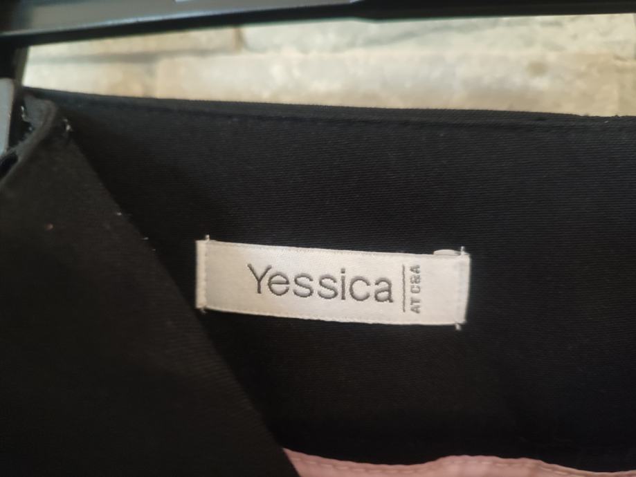 1. Ženske elegantne hlače v črni barvi, znamke Yessica (C&A). Velikost 34, primerne za S, dolžina 100 cm, širina v pasu 38 cm, širina v bokih 53 cm. Material: 100 poliester.