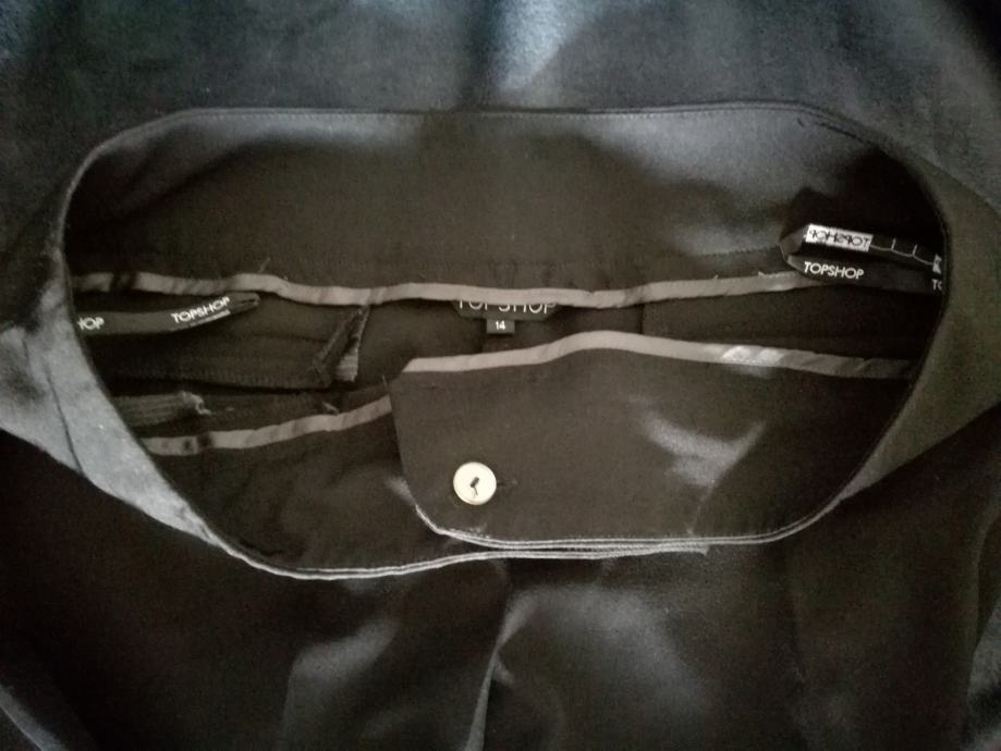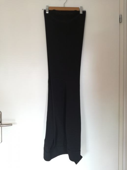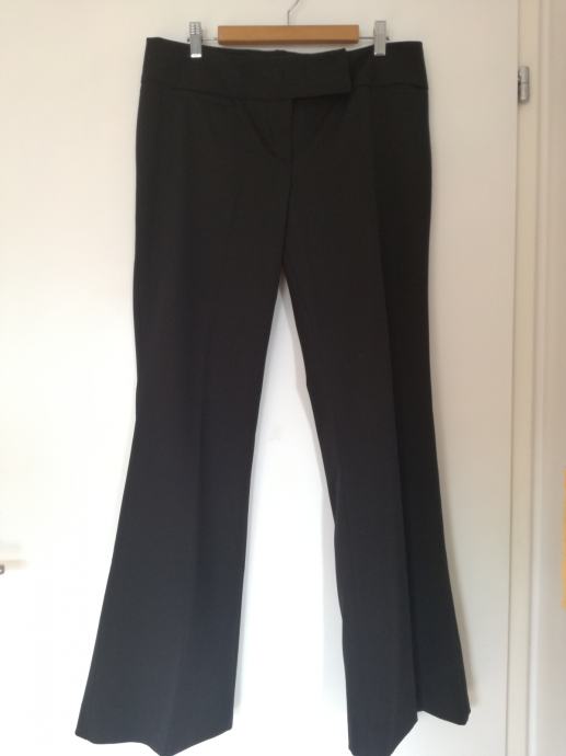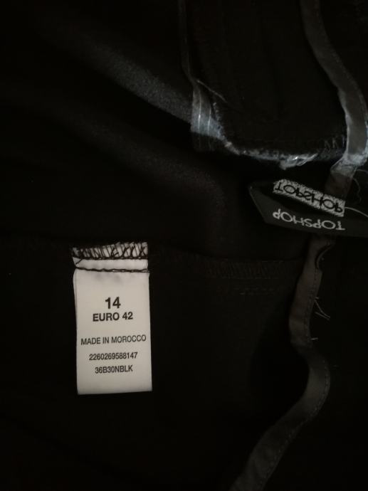 Prodam nikoli nošene elegantne črne hlače znamke TopShop v št. 14 (EU 42). Razkorak (notranja dolžina hlačnice) meri 80 cm, možnost krajšanja; material: 96% poliester, 4% elastan.