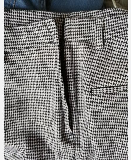 Nove, nenošene hlače s pepita vzorcem. Dolžina nad gležnji. Rahlo raztegljive, zapenjanje z zadrgo ob strani. Imajo tudi zankice za pas.
