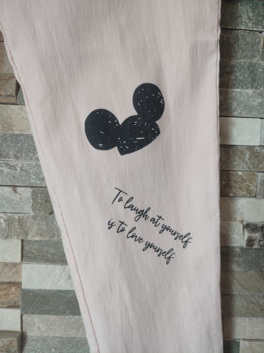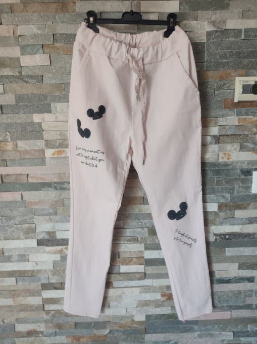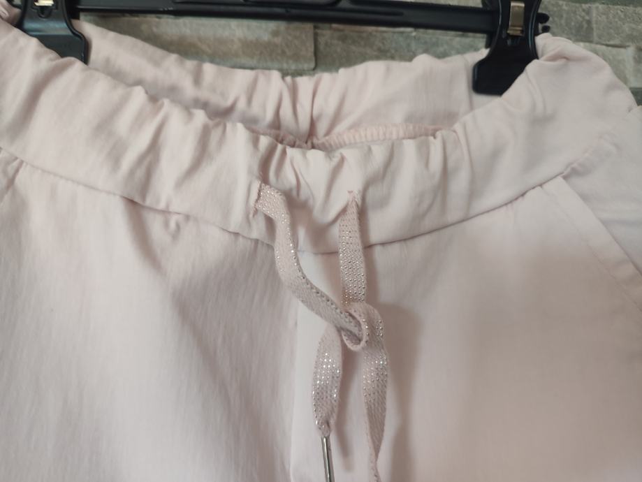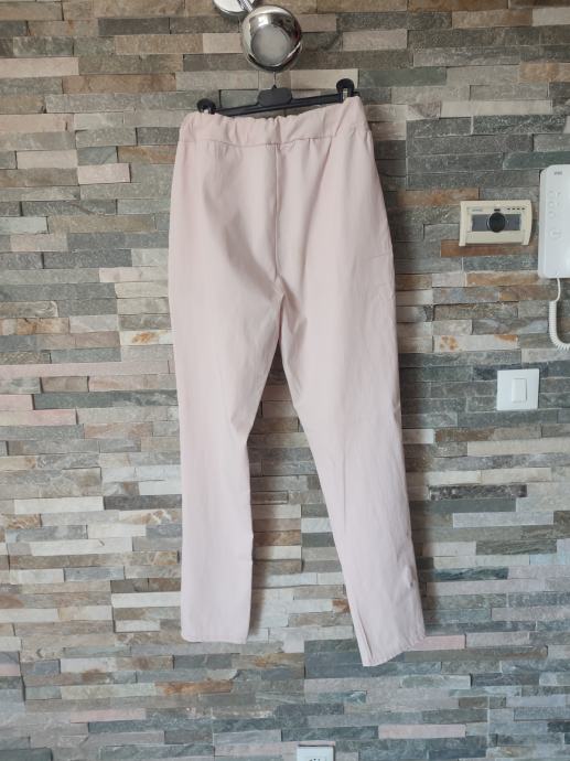 1. Ženske tanjše hlače v svetlo roza barvi. Hlače so v pasu na elastiko in vrvico. Velikost S, visok pas, dolžina 98 cm, širina v pasu 32 cm ( se razširi do 43 cm), širina v bokih 57 cm. Material: 35 % poliester, 60 % viskoze in 5 % elastana.