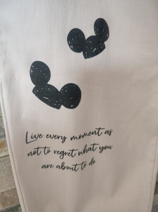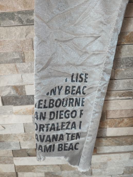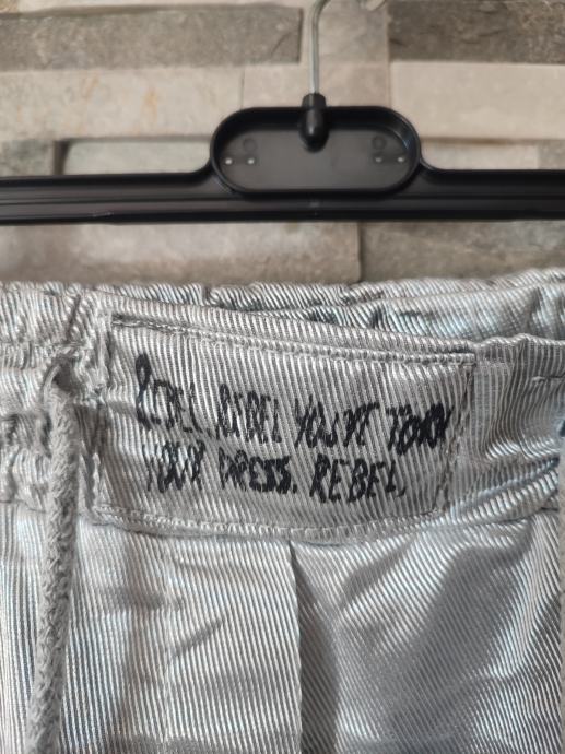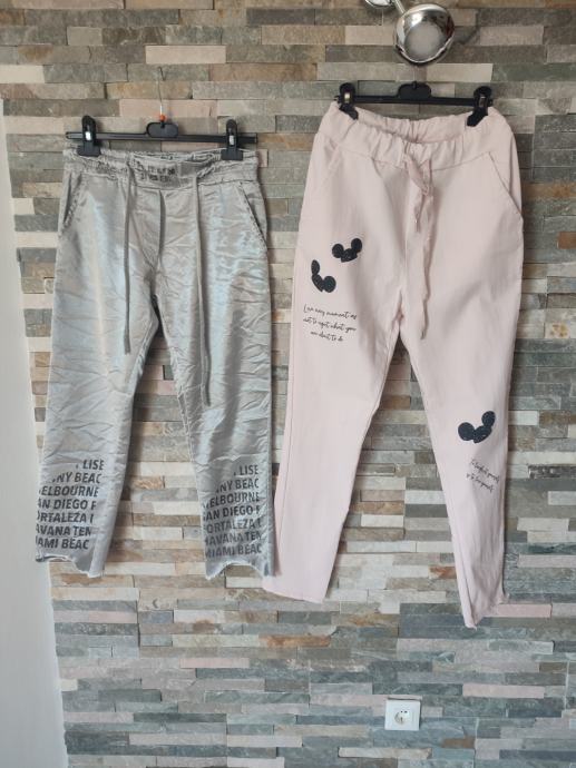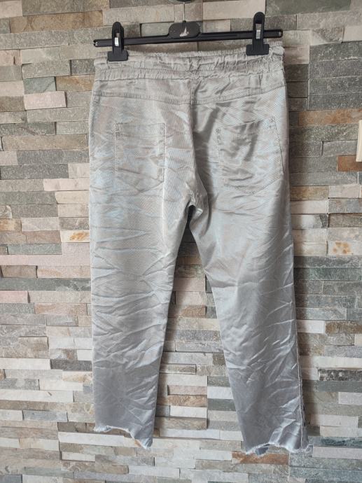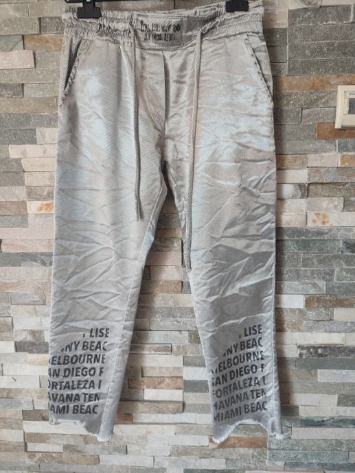2. Ženske hlač s srebrni barvi s črnim napisom na sprednjem spodnjem delu hlačnice. Hlače so v pasu na elastiko in vrvico. Velikost S, visok pas, dolžina 84 cm, širina v pasu 36 cm ( se razširijo), širina v bokih 57 cm. Material:55 % bombaža, 10 % poliester, 30 % viskoze in 5 % elastana.