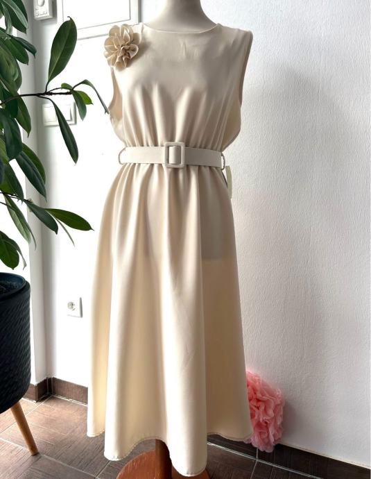 Prodajam novo poletno žensko obleko bež barve iz lanenega materiala. Obleka ima eleganten kroj z okrasno rožo na ovratniku in pasom, ki poudari silhueto. Popolna izbira za tople poletne dni ali svečane priložnosti. Možnost osebnega prevzema v MB po predhodnem dogovoru, paket pošljem preko Pošte Slovenije, ptt že v ceni.