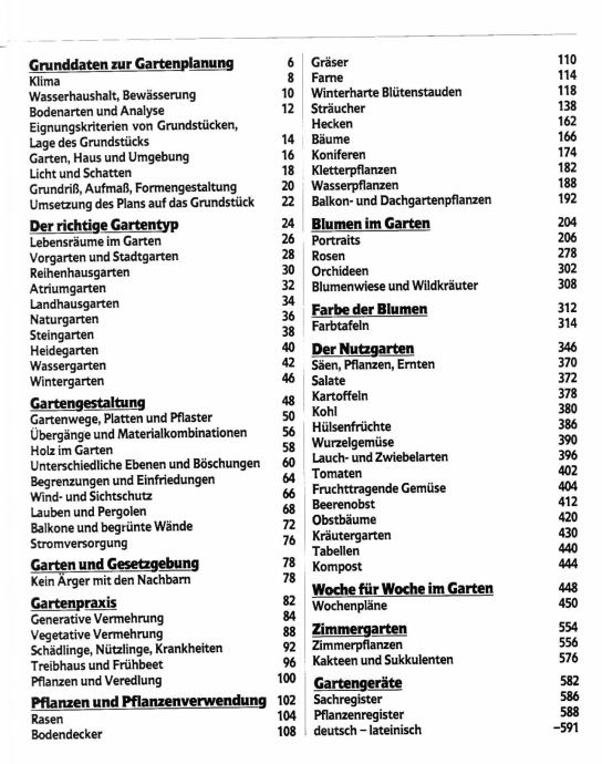 Poglavja o: klimi, zalivanju, kompostiranju in gnojenju, načrtovanju vrta, pridelavi zelenjave, gojenju cvetlic …