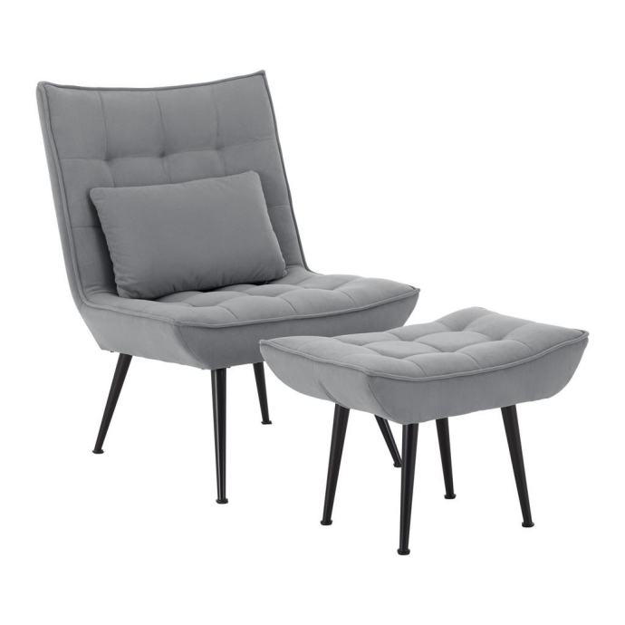 Ta izdelek je na voljo SAMO NA SPLETU! Naslanjač v sivi barvi vas vabi k počitku in vam ponuja popoln kraj za sprostitev. Zahvaljujoč linearnemu videzu in nežnim barvam lahko počivalnik kombinirate z različnimi slogi. Z velikostjo približno 71 x 96,5 x 82 cm (Š x V x G) in prikupno žametno prevleko zagotavlja udobno sedenje. Seveda je opremljen tudi z mehko penasto podlogo. Stožčaste kovinske noge v črni barvi dajejo fotelju stabilnost in poudarjajo preprost videz. Posebej praktičen je ujemajoč se tabure, na katerega lahko udobno položite noge. Priložena je tudi okrasna blazina dimenzij približno 30 x 50 cm. Počivalnik je mogoče obremeniti do največ 140 kg.
