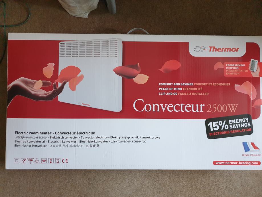 Prodam nov še zapakiran električninkonvekcijski grelec moči 2500 W, predviden za montažo na steno. Dodatno priložene nogice za možnost uporabe tudi na kolesih.