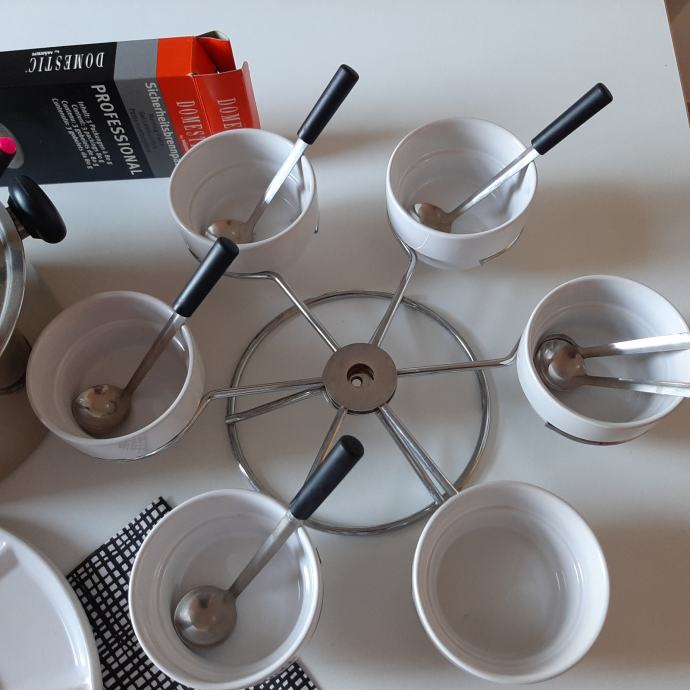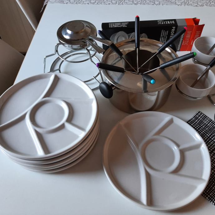 Prodam 2x rabljen fondi set: gorilnik, inox lonec, krožnike, skodelice za omko, nabodala-vilice
