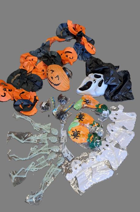lampijone, velik pajek, plastične košare za sladkarije, smrtna glava s pelerino, plastična okostnjaka, masko krik, male plastične okostnjake, plastične male pajke, girlande, smrtne glave s pajčolanom, pajčevina iz blaga,....