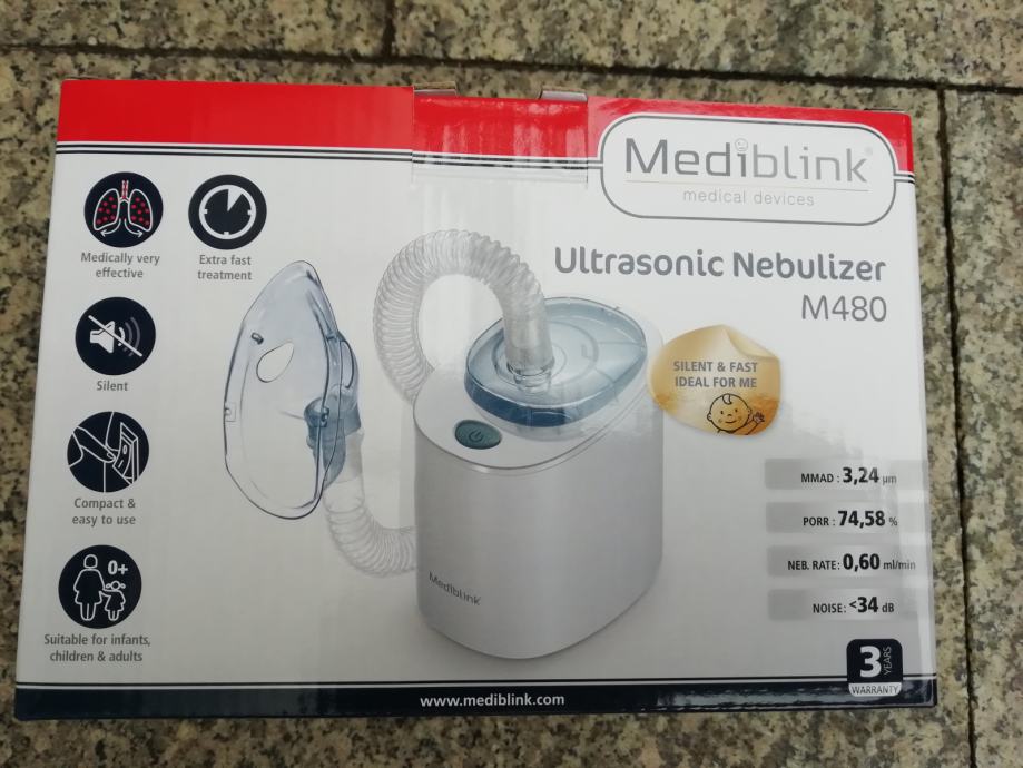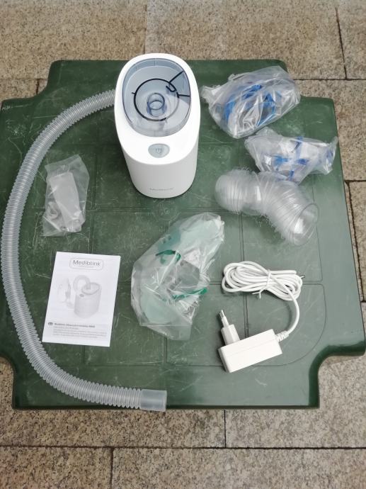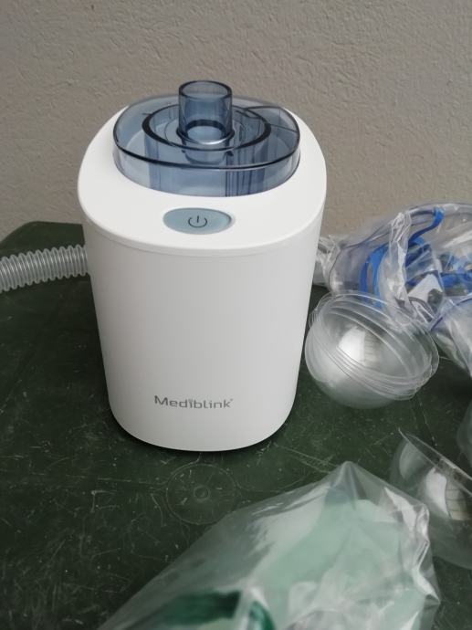 Malo rabljen ultrazvočni inhalator, Mediblink M480, popolnoma čist, vsa dodatna oprema, poleg nerabljene rezervne obrazne maske dodana še ena nerabljena obrazna maska, polni se z fiziološko raztopino. Z računom, v garanciji do 4. oktobra 2028.