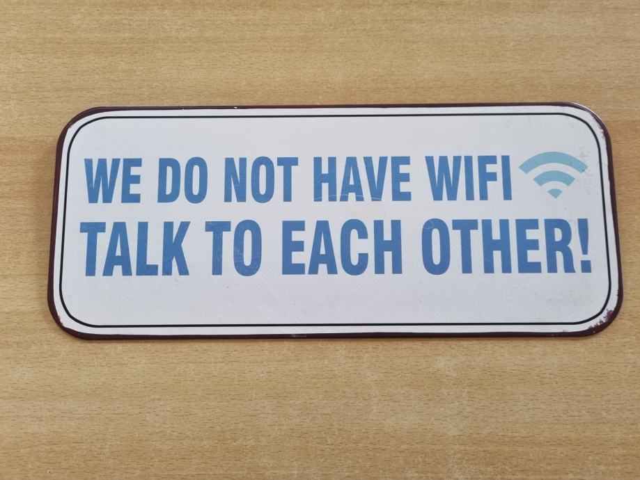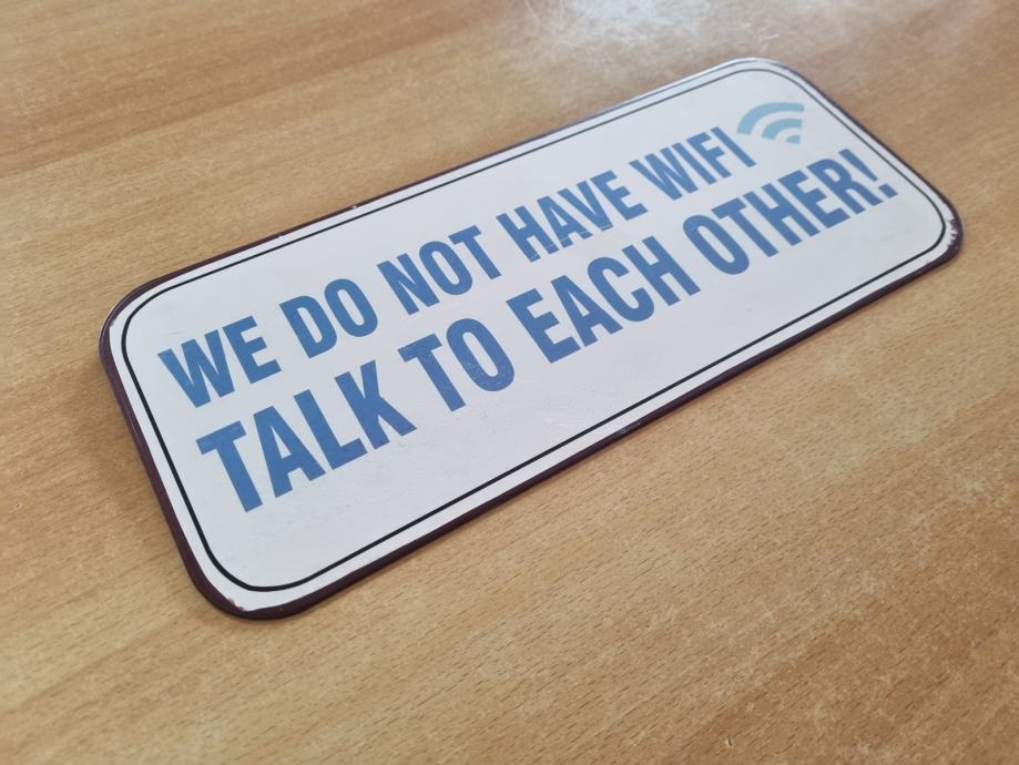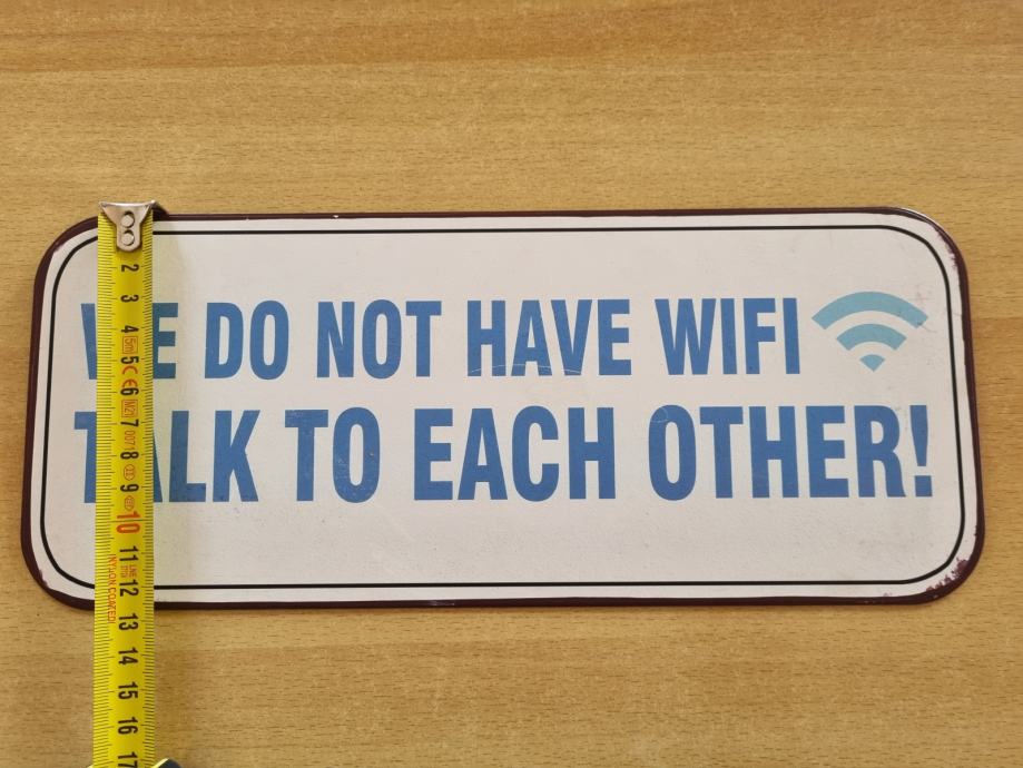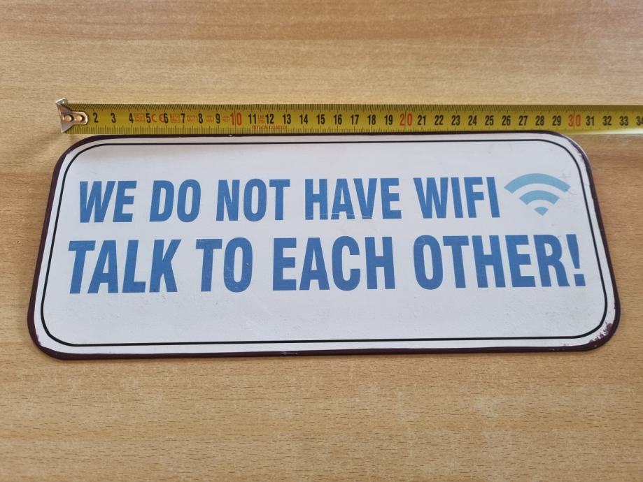 Prodam kovinsko tablico z napisom We do not have WiFi Talk to each other. Dimenzije so 30x13 cm. Tabla ima zadaj nosilca za namestitev na steno. Ogled in prevzem sta možna na Vrhniki ali v Ljubljani (Črnuče). Več informacij na 051 676 709 - Karl.