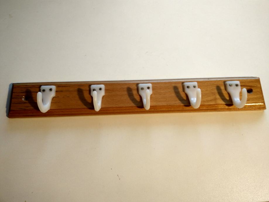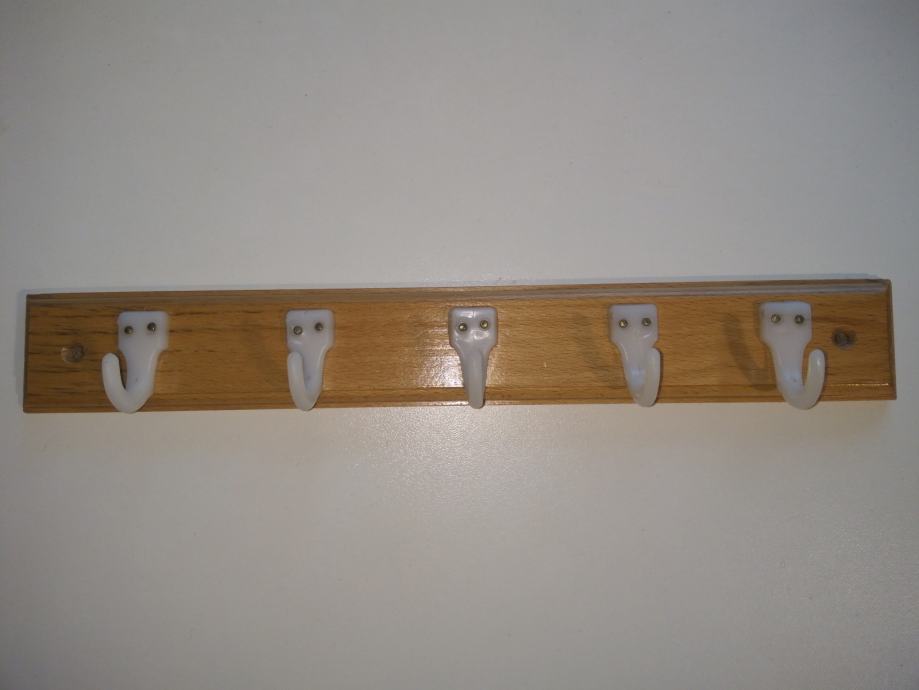 Prodam lesen obešalnik s petimi plastičnimi klukicami dolžine 32 cm in širine 4,5 cm.