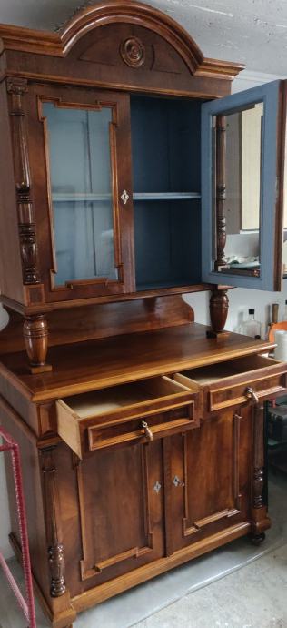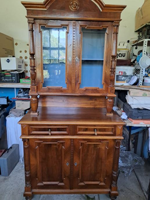 Prodajamo lepo ohranjeno in restavrirano starinsko omaro iz masivnega lesa, z bogatimi rezbarijami in steklenimi vrati v zgornjem delu.
