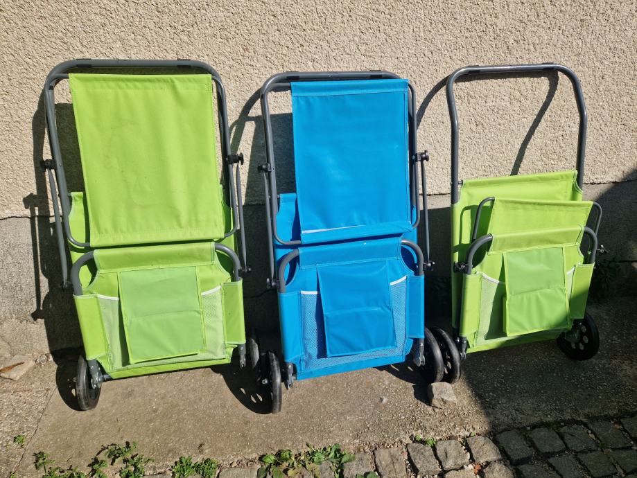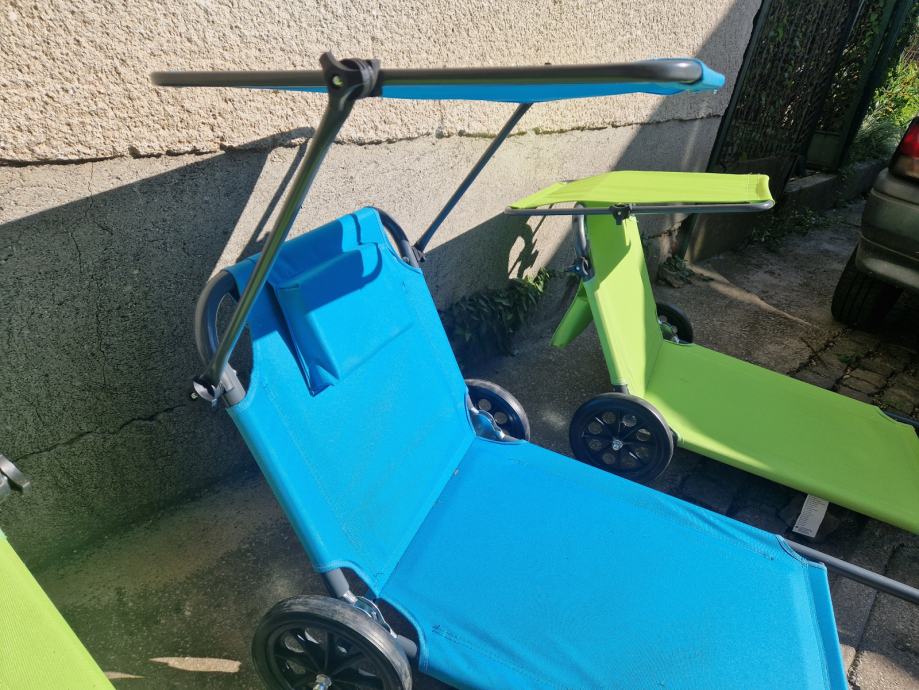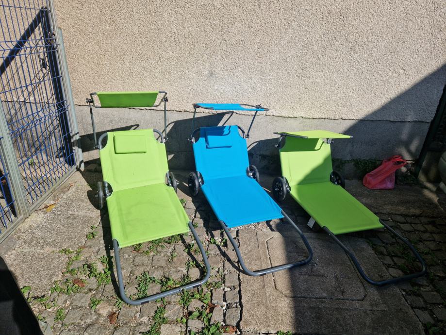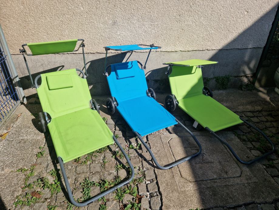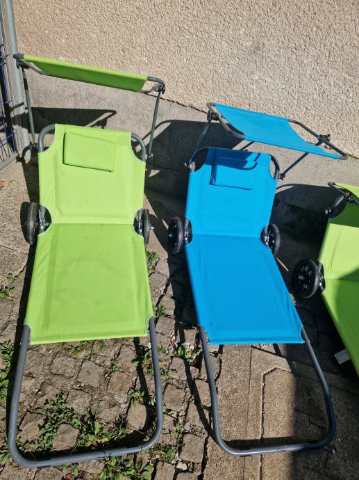 Prodam zelo lepe ležalnike primerni za na vrt ali na plažo. Dva sta popolna, tretjemu mankajo povezovalne palice za senčnik, vse razvidno iz slik.