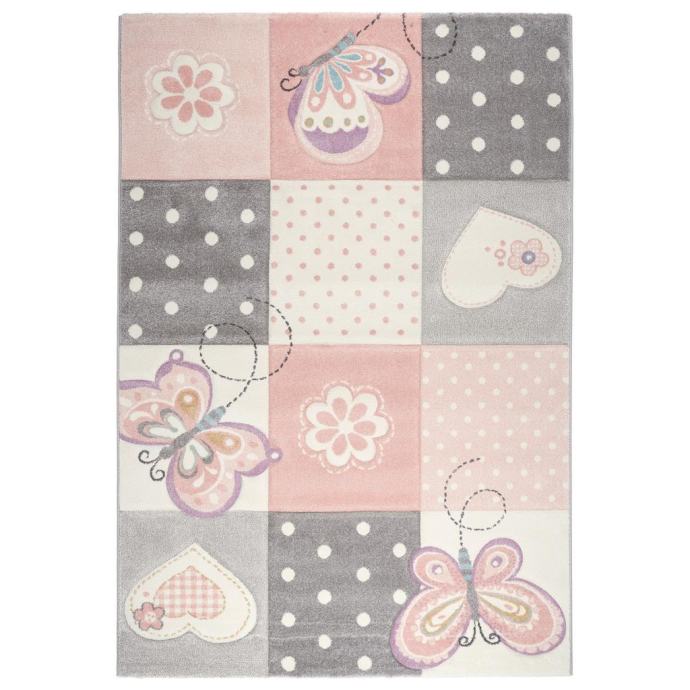 Vnesi dobro voljo v otroško sobo s to roza in sivo otroško preprogo. Približno 160 x 230 cm (Š x D) velika preproga iz 100% polipropilena se ponaša z otrokom prijaznim dizajnom, polnim metuljev, in višino flora približno 13 mm. Strojno tkana preproga je enostavna za nego in primerna za talno ogrevanje. Tako postane v otroški sobi res prijetno!